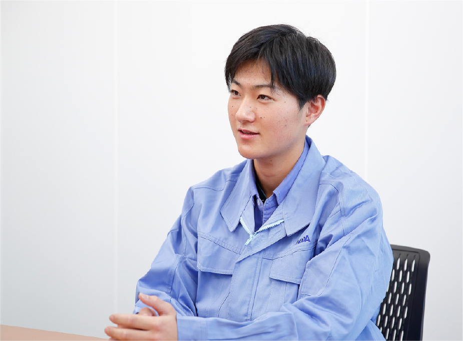 - 製造で働く向笠さんとは、高校の先輩・後輩の間柄。同じ野球部に所属し、在学中も交流があった。そのため、就活時にノダを検討する際にも「向笠さんが入社した会社だ」という安心感があったという。また、自身も昔から建材に関わる仕事に興味があり、向笠さんを通じて社風や人間関係の良さを知り、ノダへの入社を決めた。