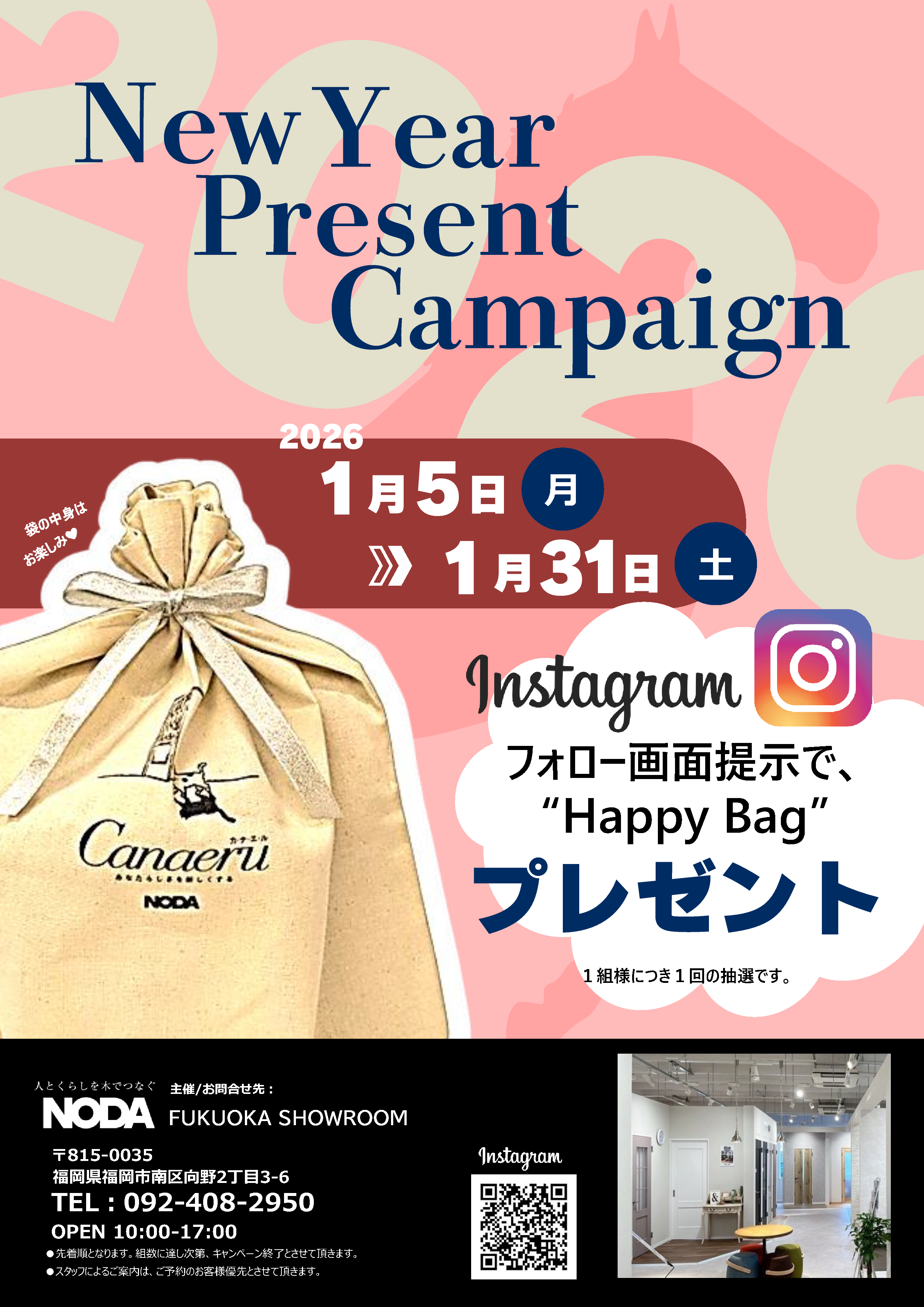 ノダInstagramのフォロー画面をご提示いただいた方へ抽選で”Happy Bag”をプレゼント!生活雑貨やキッチングッズ等、中身はお楽しみの“福岡ショールーム オリジナル福袋”となります。 皆様のご来場心よりお待ちしております。 ➤参加費無料● 期間:1/31(土)迄 【先着順】 ※駐車場含め、ご予約のお客様優先案内とさせて頂きます。 ※1組様につき1回の抽選とさせていただきます。 詳細はお電話にてお問い合わせください。(092-408-2950)