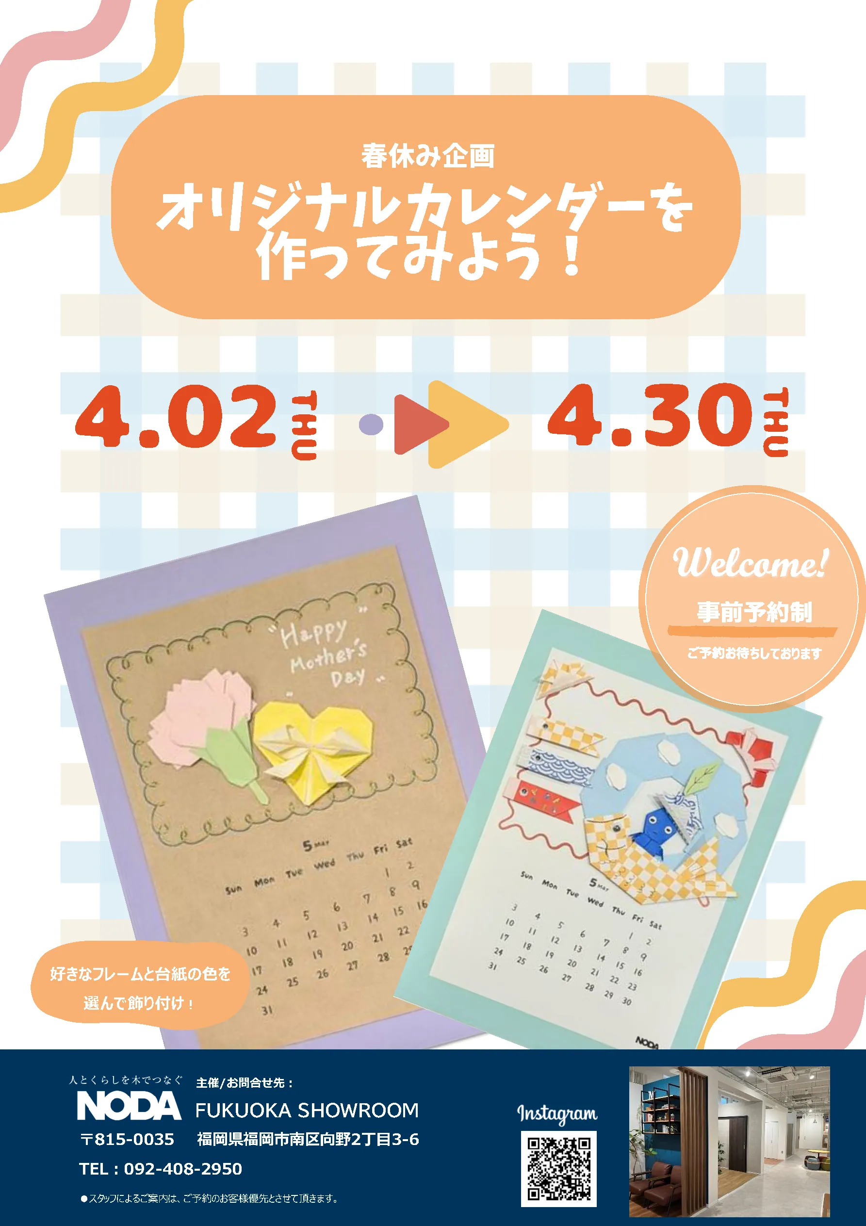 \春休み企画/好きなフレームと台紙を選んで”オリジナルのカレンダー”を作ってみませんか?端午の節句や母の日にぴったりな飾りをご用意しております♪春の思い出にぜひご参加ください! ➤参加費無料➤事前予約制 ●期間:4/2(木) ~ 4/30(木) ※駐車場含め、ご予約のお客様優先案内とさせて頂きます。
