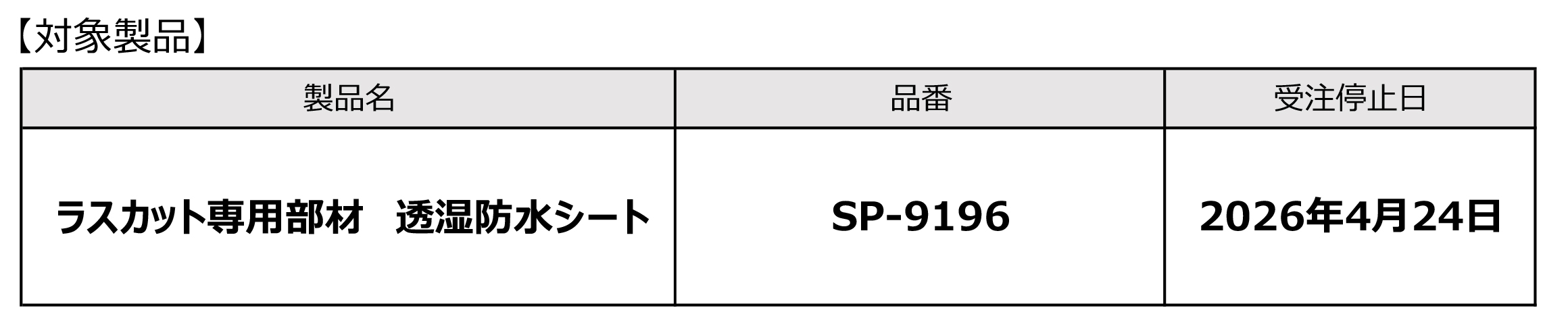 ご承知の通り、昨今の中東情勢の緊迫化に伴い、一部原材料において調達遅延および供給不安が発生しております。このような状況を受け、誠に不本意ではございますが、下記製品につきまして、一時的に受注停止の措置を取らせていただくこととなりました。代替調達を含め対応を進めておりますが、受注再開時期については未定となっております。進展があり次第改めてご連絡申し上げます。