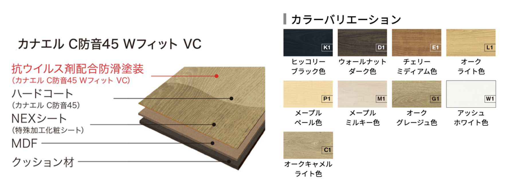 シンプルな木質感が、居心地のいい空間を演出する「カナエルC」のカラーラインアップを取り揃えた製品。「抗ウイルス剤配合防滑塗装」を施しているため、滑りにくく、ウイルス感染の危険性も抑えられる床材となっています。